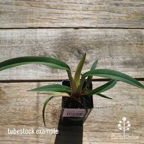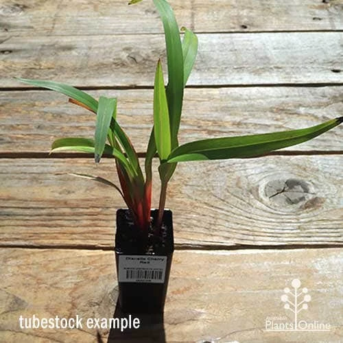 APPEARANCE : Graceful growing native flowering grass with bright green arching leaves with striking cherry red leaf bases. Tiny blue flowers on long stems in later winter-spring; followed by oval purple-blue berries in summer.