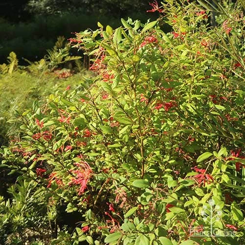 APPEARANCE: Compact growing evergreen native with large showy clusters of red hot flowers throughout most of the year, and untypical small rounded leaves with a bronze tint when young. Very similar to LadyO.