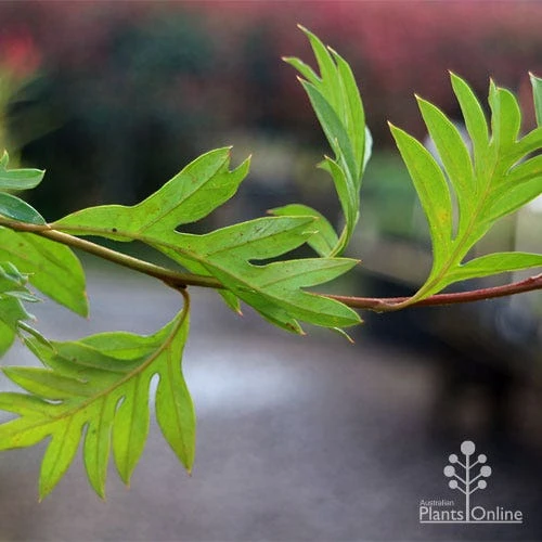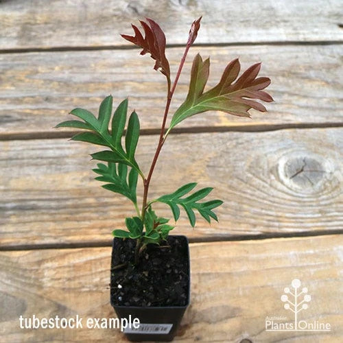 Scrambling dense ground cover, excellent for embankments, steep slopes, rockeries, or as a weed suppressant. Deeply cut leaves, deep red-burgundy flowers, long arching stems, and new russet-red-flushed growth, make a very attractive native plant. Grows only 30cm high but up to 3m across.