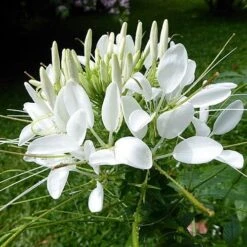 DESCRIPTION: Pale blue open flowers on long stems ideal for cutting. Ferny foliage. Decorative urn-shaped large seedpods suitable for drying. Classic cottage garden plant.